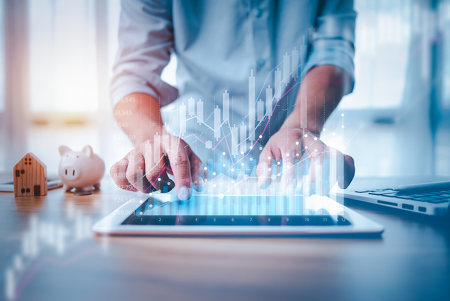 business finance technology and investment concept. Stock Market Investments Funds and Digital Assets. businessman analysing forex trading graph financial data. Business finance background.